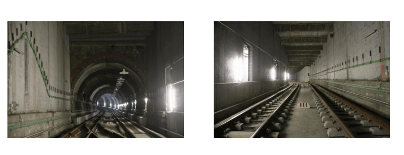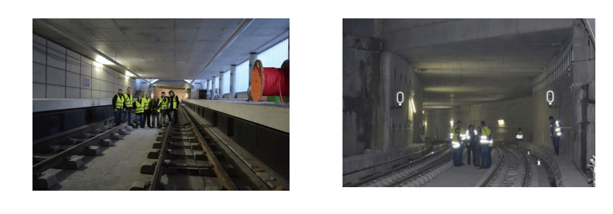 La vía está formada por carril de 54Kgr/ Mlineal sobre traviesas STEDEF arriostradas y descansan sobre la solera encajadas sobre unas cazoletas de caucho. La sujeción del carril se ejecuta con grapa y tirafondo.