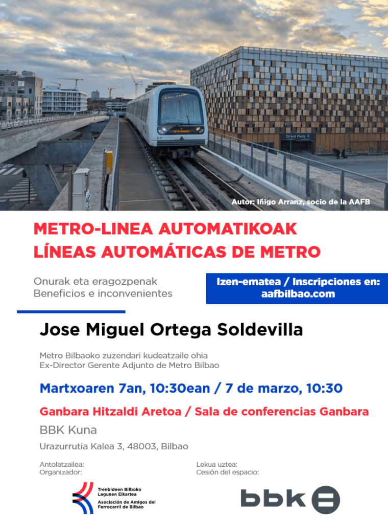 El próximo 7 de marzo a las 10:30, Jose Miguel Ortega Soldevilla, Ex-Director Gerente Adjunto a Metro Bilbao, impartirá una conferencia sobre líneas automáticas de metro. . Durante la charla de 1h 30 min hablará sobre los beneficios e inconvenientes de operar una red 100% automática sin personal de conducción, además también expondrá ejemplos en los que se ha desarrollado el cambio de un sistema con personal de conducción a uno automático.