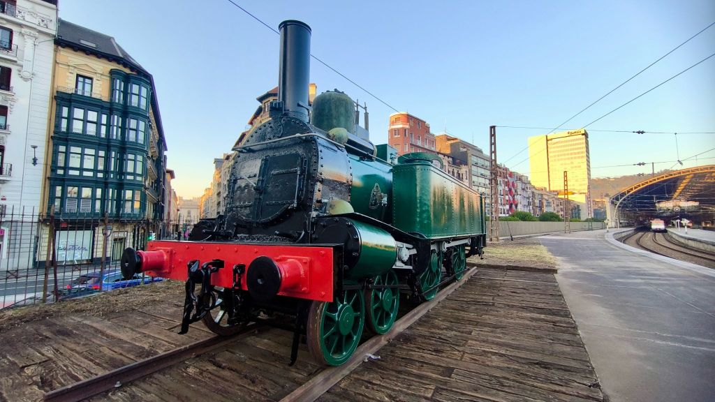 Una de las primeras locomotoras que circulo por la línea en 1863 permanece expuesta en la estación de Abando en Bilbao.