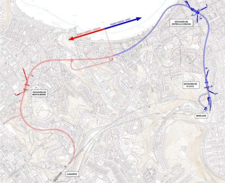 El desarrollo de la obra se ha dividido en dos tramos, el primero de los cuales es Lugaritz a Miraconcha, cuya estación está en fase de obra, pero con la estación de Bentaberri y el túnel de unión con Lugaritz terminado y puesta ya la vía. El proceso de avance se ha ejecutado con rozadora.