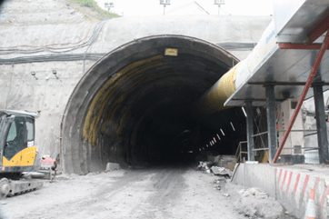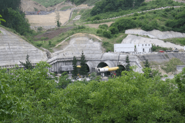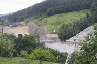 En la imagen de la derecha, se aprecia el túnel artificial, el muro artificial para sostener la vía y a la derecha, la galería central con las de vía única al costado.